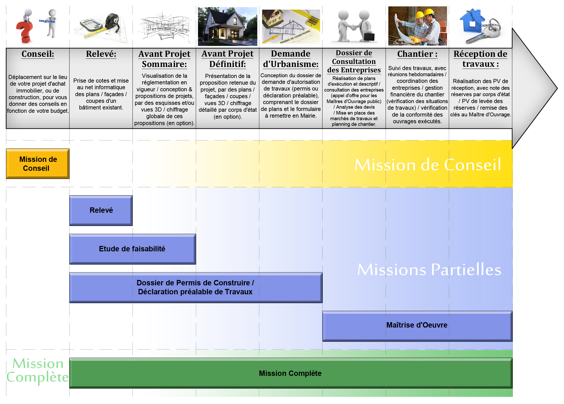 En fonction de la nature et de l'avancement de votre projet, le Maître d'œuvre adapte sa mission, qui peut être partielle ou complète.